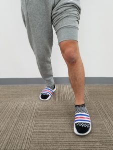 立った状態で片足のつま先を立てます。反対側の足は軽く前に出します(バランスが崩れそうな方は手すりや壁などに手をかけると安定)。