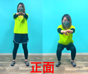 ※下ろしたときにつま先から膝が出ないようにしていきましょう