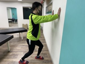 次に、体育の準備運動でもお馴染みのアキレス腱伸ばし。これに手で壁を押す力を加えると、より強いストレッチを掛けることが出来ます。ゆっくりじんわりと伸ばしていきましょう!